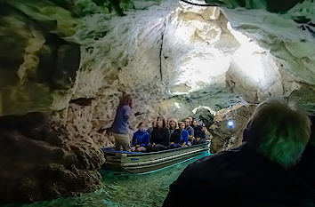 Galerie verschiebbare Bilder Fotos: Rainer Halama, Rainer Halama, Franzfoto, Freak-Line-Community und qwesy qwesy - CC BY-SA Karstquellen gehören ja zu den interessantesten Naturerscheinungen auf unserer Erde. Sie sind oft besonders wasserreich und manchmal kommen sogar ganze Flüsse aus dem Berg, wie das zum Beispiel bei der Quelle der Buna in Bosnien-Herzegowina der Fall ist. Aber auch in Deutschland quellen an einigen Stellen beachtliche Wassermengen aus dem Boden. Hierzu gehören beispielsweise der Aachtopf, der Blautopf und das Quellgebiet der Pader. Durch unterirdische Höhlen gelangt das Wasser dort an die Erdoberfläche. Doch leider kann man in diese Höhlen nicht hineingelangen, lediglich in einigen wenigen ist das mit Tauchausrüstungen und unter hohen Sicherheitsvorkehrungen möglich. Ganz anders verhält sich das bei der Wimsener Höhle. Dort kann man mit einem Boot in die Quelle der Ach (ein beliebter und häufiger Flussname im schwäbischen Land) hineinfahren. Das ist einzigartig. Das gefiel auch dem Herzog von Württemberg und späteren König Friedrich I., der 1803 die Höhle besuchte, weshalb die Wimsener Höhle auch als Friedrichshöhle bezeichnet wird. Ein lateinischer Spruch erinnert am Eingang der Höhle an den Besuch des Monarchen. Allzu weit kommen die Besucher bei der Höhlenbesichtigung aber dann doch nicht. Nach 70 Metern senkt sich die Höhlendecke bis zur Wasseroberfläche. Doch im Anschluss an die Besichtigung dieser Naturerscheinung kann noch eine Wanderung zu den nahe liegenden Wimsener Wasserfällen unternommen und in der am Fluss liegenden Gaststätte eingekehrt werden. Auf deren Homepage können außerdem die Eintrittskarten für die Höhlentour online erworben werden. Öffnungszeiten und weitere Informationen über die auch als Friedrichshöhle bezeichneten Wimsener Karsthöhle: