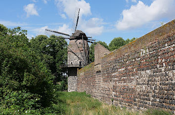 Galerie verschiebbare Bilder Zu Unrecht gehört für viele Menschen die ehemalige Rheinfestung Stadt Zons zu den touristischen Geheimtipps. Dabei hat der noch vollständig von einer Stadtmauer umgebene Ort eine sehr romantische Ausstrahlung. Deshalb laden wir hier zu einer kleinen virtuellen Stadtführung ein. Heute ist die Stadt Zons nur noch ein Ortsteil von Dormagen. Doch ursprünglich wurde von hier der Schiffsverkehr auf dem Rhein kontrolliert. Das geschah ab 1372 im Auftrag des Erzbischofs von Köln, der hier mittels Zolleinnahmen einen Teil seines Staatshaushaltes einschließlich seines luxuriösen Lebens finanzierte. Deshalb gibt es auch innerhalb der Stadtmauer noch das von einer eigenen Mauer und dem Juddeturm (letztes Bild) geschützte Schloss Friedestrom mit seinem Schlossgarten. Der bischöfliche Schultheiß residierte hier. Außerdem kann am Schlosszugang das heutige Kreismuseum Zons mit seiner Jugendstil-Ausstellung besichtigt werden. Da die Größe der Festungsstadt nur 250 x 300 Meter misst, gab es mit dem Rheintor im Norden und dem Südtor nur zwei Zugänge, die beide noch vollständig erhalten sind. Das Gleiche gilt für die mit mehreren Türmen bestückte Stadtmauer. Lediglich für die heute in diesen Stadtteil führende Schlossstraße wurde ein Teil der Mauer abgerissen. Zusammen mit einer kleinen Pforte im Osten und einem zur Windmühle umgebauten Festungsturm sind das die wesentlichen Veränderungen, die nach dem Mittelalter an der Ummauerung stattfanden. In der Stadt selber ist die Situation allerdings etwas anders. Drei Stadtbrände sowie mehrere Kriege und Besatzungen sorgten dafür, dass die heutige Bebauung im Wesentlichen erst nach dem 17. Jahrhundert entstand. Verschwunden ist allerdings auch der einst direkt neben der Stadtmauer fließende Rhein. Er fließt inzwischen ein paar Hundert Meter weiter im Osten und der Hochwasserschutz verhindert, dass man ihn sieht. Vorhanden ist aber noch der ehemalige Treidelpfad, denn alle Schiffe mussten bis zur Erfindung der Dampfschifffahrt flussaufwärts mit langen Seilen gezogen werden. Auswahl von Veranstaltungen für Dormagen und Umgebung: