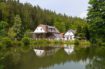 Bilder werden geladen Selten wird dem Ausflügler auf einer Wanderstrecke so viel an Gastronomie geboten wie im Raudabachtal. Denn wo einst die Menschen ihren Lebensunterhalt durch Mühlenbetriebe verdienten, laden heute 8 Gaststätten mit Herbergsbetrieb zur Einkehr ein. Verbunden sind diese durch eine kleine asphaltierte Straße, die ideal zum Wandern und Radfahren ist. Sie ist 8 Kilometer lang und führt von Weißenborn nach Kursdorf. Zahlreiche Waldwege führen auch in die Seitentäler und parallel zum Tal, so dass man auf den umliegenden Höhen zurückwandern kann. Bereits im Mittelalter wurden hier die ersten Mühlen erwähnt. Von ehemals 11 Betrieben wurde noch vor 100 Jahren das Mühlgut mit Eseln hinauf nach Eisenberg und in die umliegenden Ortschaften geschafft. Das und mehr erfährt man im Mühlenmuseum an der Naupoldsmühle, eine der Mühlen im Tal. Besonders erwähnenswert ist auch Milos Waldhaus am Beginn des Tales. Es ist das ehemalige Wohnhaus von Milo Barus, dem einst stärksten Mann der Welt. In Erinnerung an ihm werden finden dort jedes Jahr Wettkämpfe statt, bei denen der stärkste Mann der Region gekürt wird. Lohnend ist außerdem die Besichtigung des Miniaturparks an der Robertsmühle am östlichen Ende des Wanderwegs. Dort können alle Mühlen noch einmal im Kleinformat besichtigt werden. Besonders romantisch ist das Mühltal außerdem in der Vorweihnachtszeit, denn dann sind alle Mühlen weihnachtlich geschmückt. Es gibt überall kleine Weihnachtsmärkte und das Tal verwandelt sich in ein Weihnachtstal. Mühlen und Gasthäuser im Mühltal: